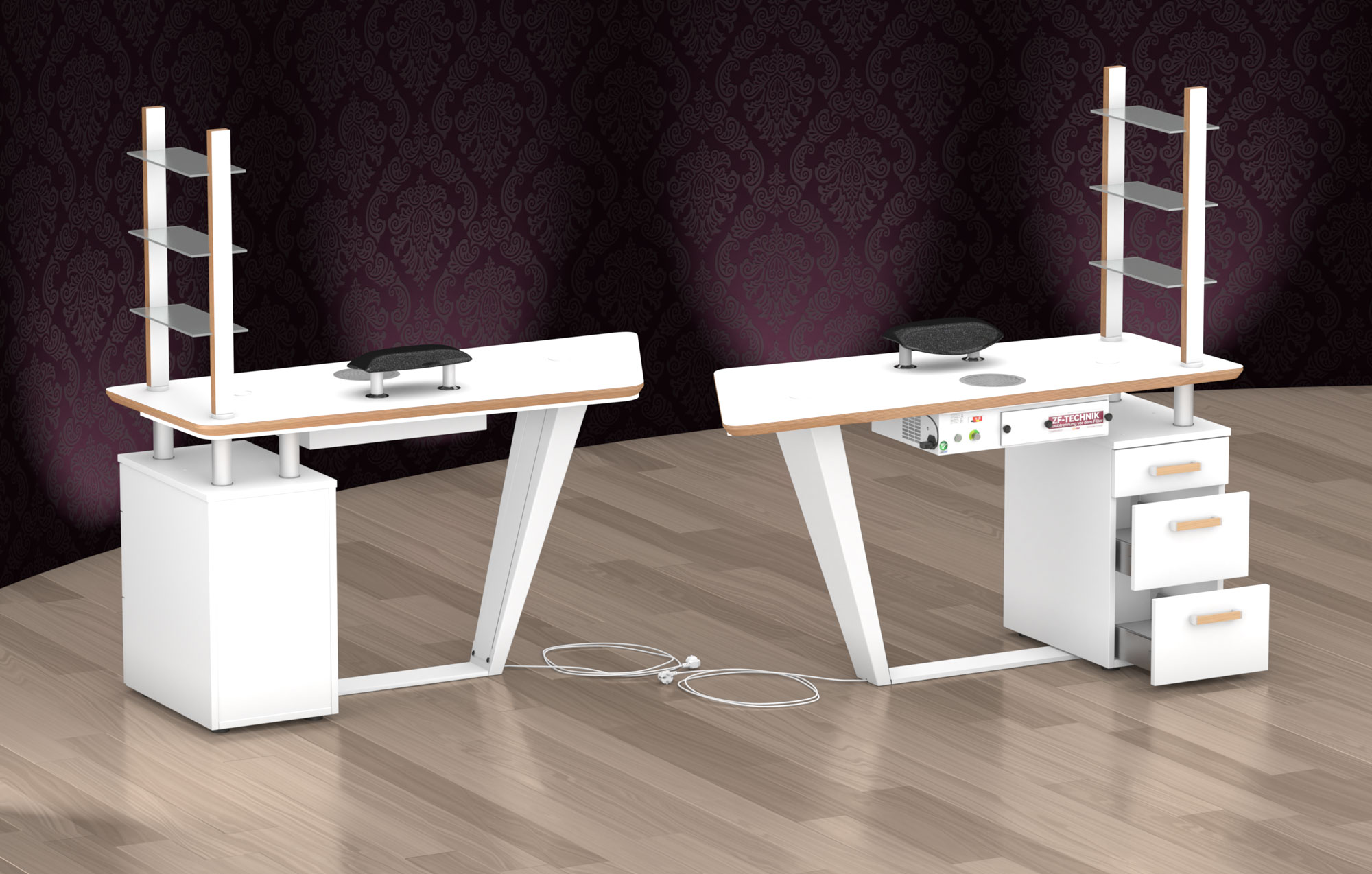 Der Nageltisch ist in zwei Größen wählbar: 1450 mm oder die kleinere Variante mit 1250 mm Breite. Die Zusatzausstattung, wie z.B. die umlaufende dezente LED-Unterbau-Beleuchtung mit einer Länge von insgesamt 2 Metern oder das passende Tischregal mit 3 sanierten Glasböden, sowie viele weitere Extras lassen keine mehr Wünsche offen.