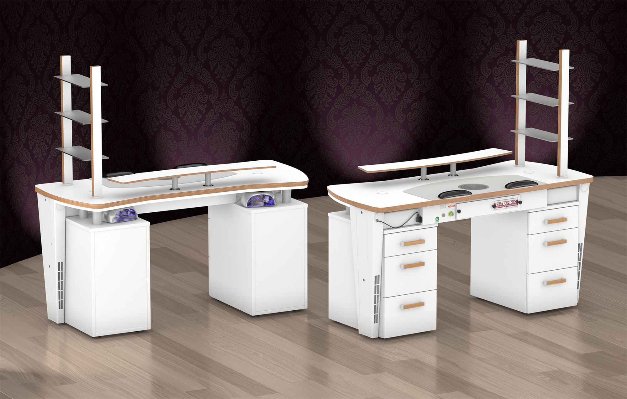 Einzigartige Tischplatte aus natürlichem Birke Multiplex-Schichtholz gepaart mit zwei geräumigen Containern verleiht dem Nageltisch ein charakteristisches Design. Verbunden mit der ultraflachen LED-Unterbau-Beleuchtung und den zwei Abluftkanälen mit integriertem Kabelmanagement entsteht einer der modernsten Nageltische für das Nageldesign.